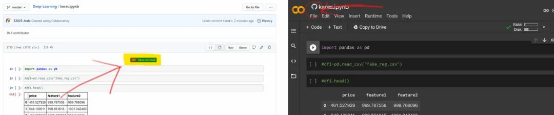 将文件提交至 GitHub 存储库后,你可以使用文件上方的快捷链接(shortcut link)从 GitHub 帐户打开文件。当使用 Google Colab 链接打开文件时,你将看到文件左上角的 GitHub 图标。