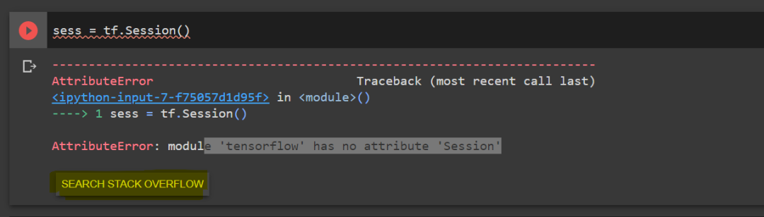 如果你的代码有问题,则可以点击输出单元格(output cell)下方的「SEARCH STACK OVERFLOW」按钮。