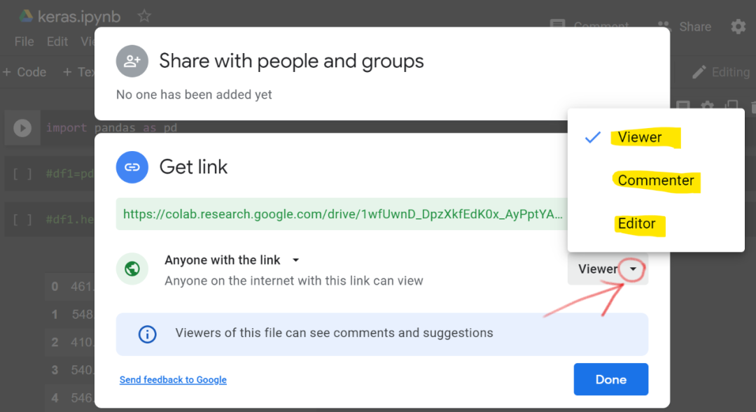 然后单击查看「Viewer」附近的小三角形图标,有 3 个共享选项。「viewer」选项仅显示具有链接的文件;「Commenter」选项可以为他人提供链接,访问者不会对你的文件进行修改,但可以评论;「Editor」选项允许拥有链接的人查看、提交和编辑你的文件。