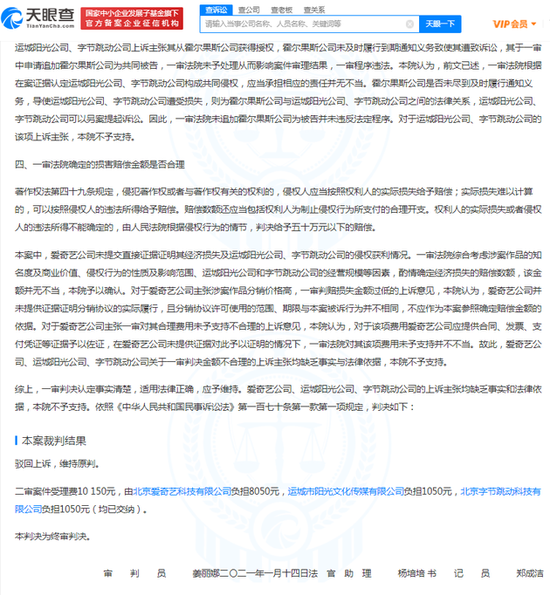 其中,北京爱奇艺科技有限公司诉称:一审法院对运城阳光公司、字节跳动公司应当承担的侵权赔偿数额的认定事实不清、适用法律错误;一审法院对运城阳光公司、字节跳动公司应当承担的合理维权费用的认定,认定事实不清、适用法律错误,应当依法改判;涉案作品分销价格为2400万元,可以认定一审判决金额偏低。裁判结果为驳回上诉,维持原判。