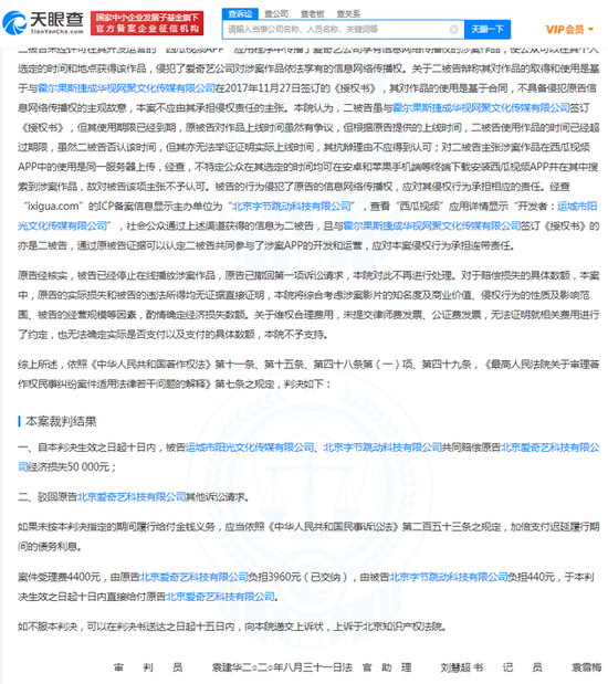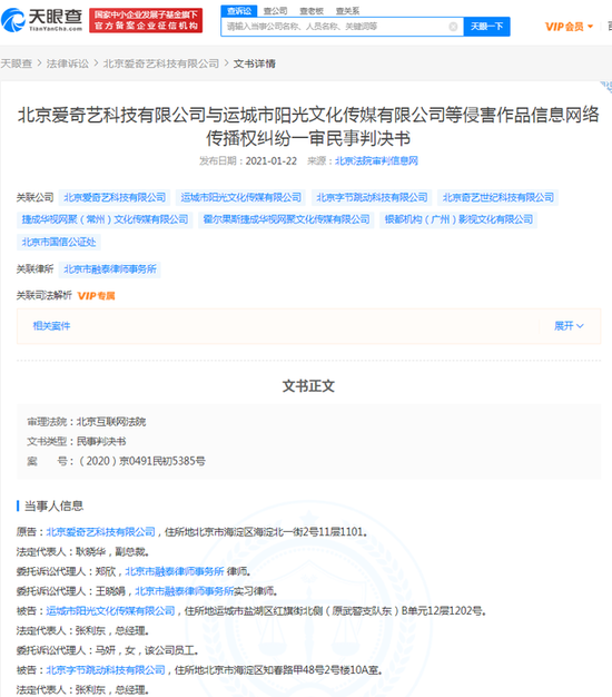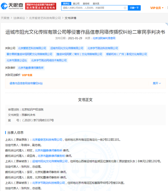 新浪科技讯 2月1日上午消息,天眼查App显示,1月29日,运城市阳光文化传媒有限公司等侵害作品信息网络传播权纠纷二审民事判决书公布,案号为(2020)京73民终3337号,上诉人(一审原告)北京爱奇艺科技有限公司,上诉人(一审被告)运城市阳光文化传媒有限公司、北京字节跳动科技有限公司。