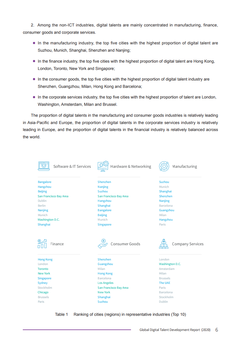 在全球主要的创新型城市中,在非ICT的传统行业,数字人才在制造、金融、消费品、公司服务四大行业相对集中。制造和消费品行业数字人才占比亚太和欧洲相对领先;公司服务业数字人才占比欧洲相对领先;金融业数字人才占比全球各区域比较均衡。