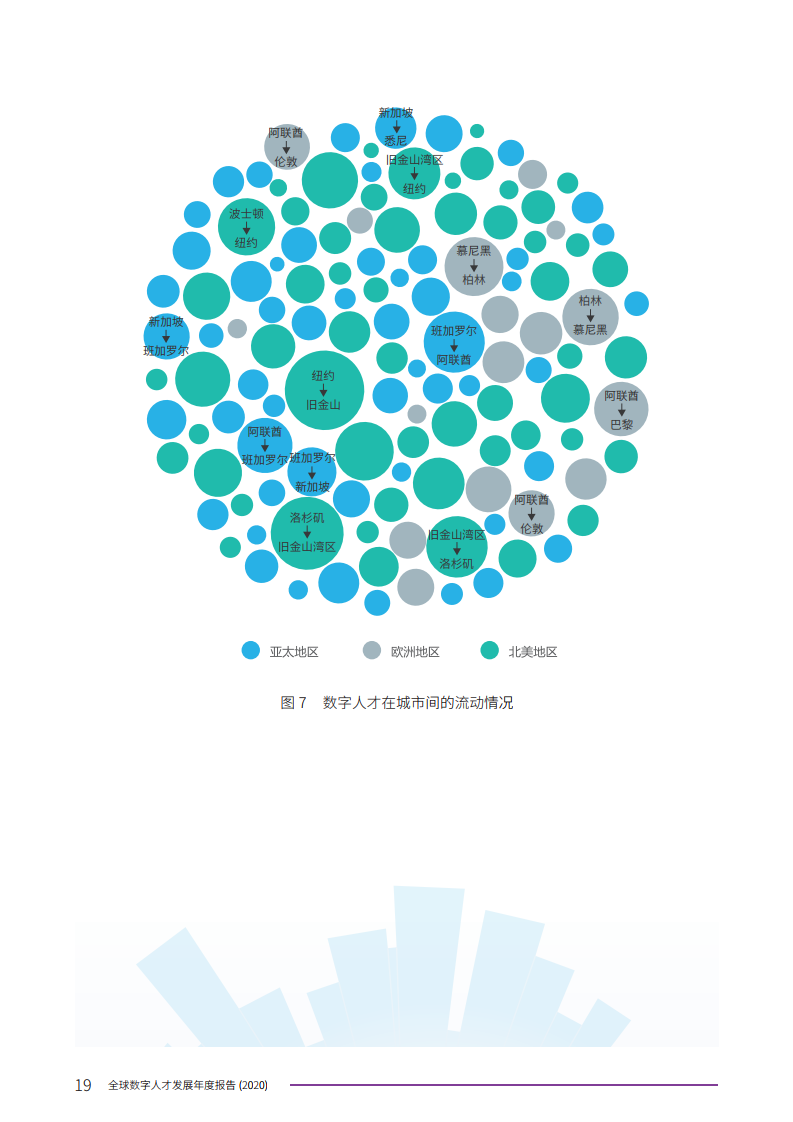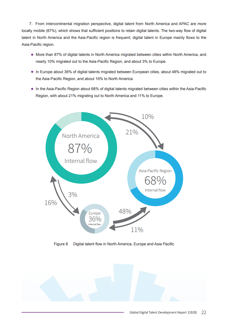 北美和亚太地区的数字人才主要在本地区流动;北美地区和亚太地区数字人才双向流动频繁;欧洲的数字人才主要流向亚太地区。