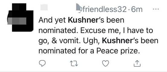 “然而库什纳被提名了。抱歉,我得去吐一下,呕……库什纳被提名了和平奖”