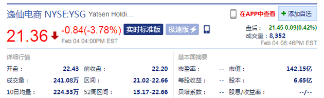 新浪科技讯 2月5日早间消息,据报道,国内美妆品牌完美日记母公司逸仙电商股价在周四美股常规交易中较前一交易日下跌0.84美元,报收于21.36美元,跌幅为3.78%。该股在随后的盘后交易中上涨0.05%,至21.36美元。逸仙电商过去52周最高价为22.60美元,最低价为15.17美元。逸仙电商周三股价大涨17.27%至22.2美元,市值达148亿美元,创上市以来新高。另据福布斯数据,逸仙电商联合创始人兼首席执行官黄锦峰已跻身全球亿万富豪榜,净资产约为30亿美元。
