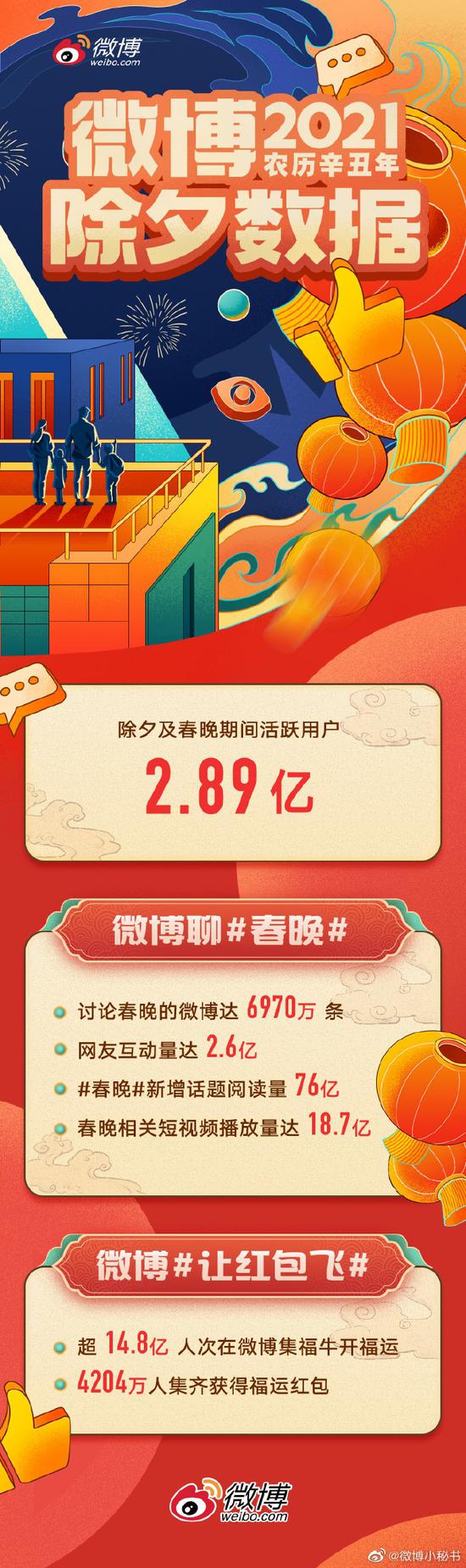 2月12日,微博公布了牛年除夕及春晚的相关数据。2月11日除夕及春晚期间,微博活跃用户数创新高达2.89亿。春晚直播期间,微博上讨论春晚的内容超6970万条,网友互动量超过2.6亿,#春晚#话题新增阅读量76亿,春晚相关短视频播放量达18.7亿。