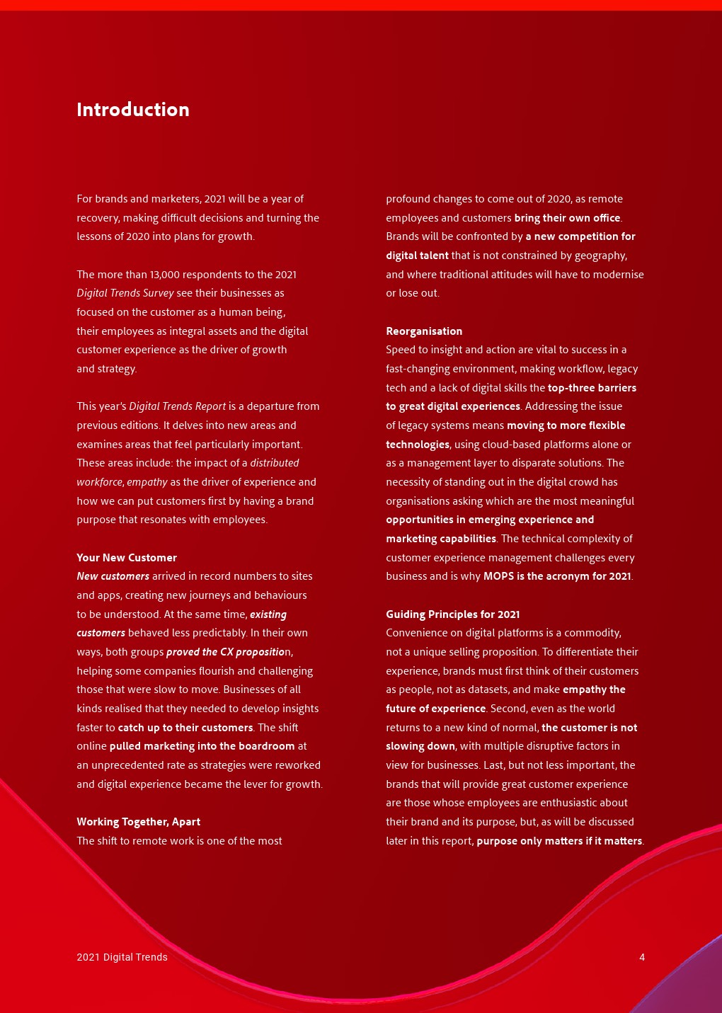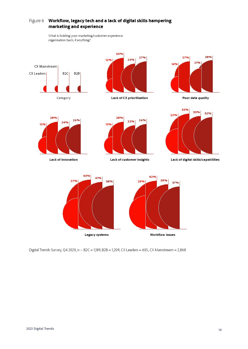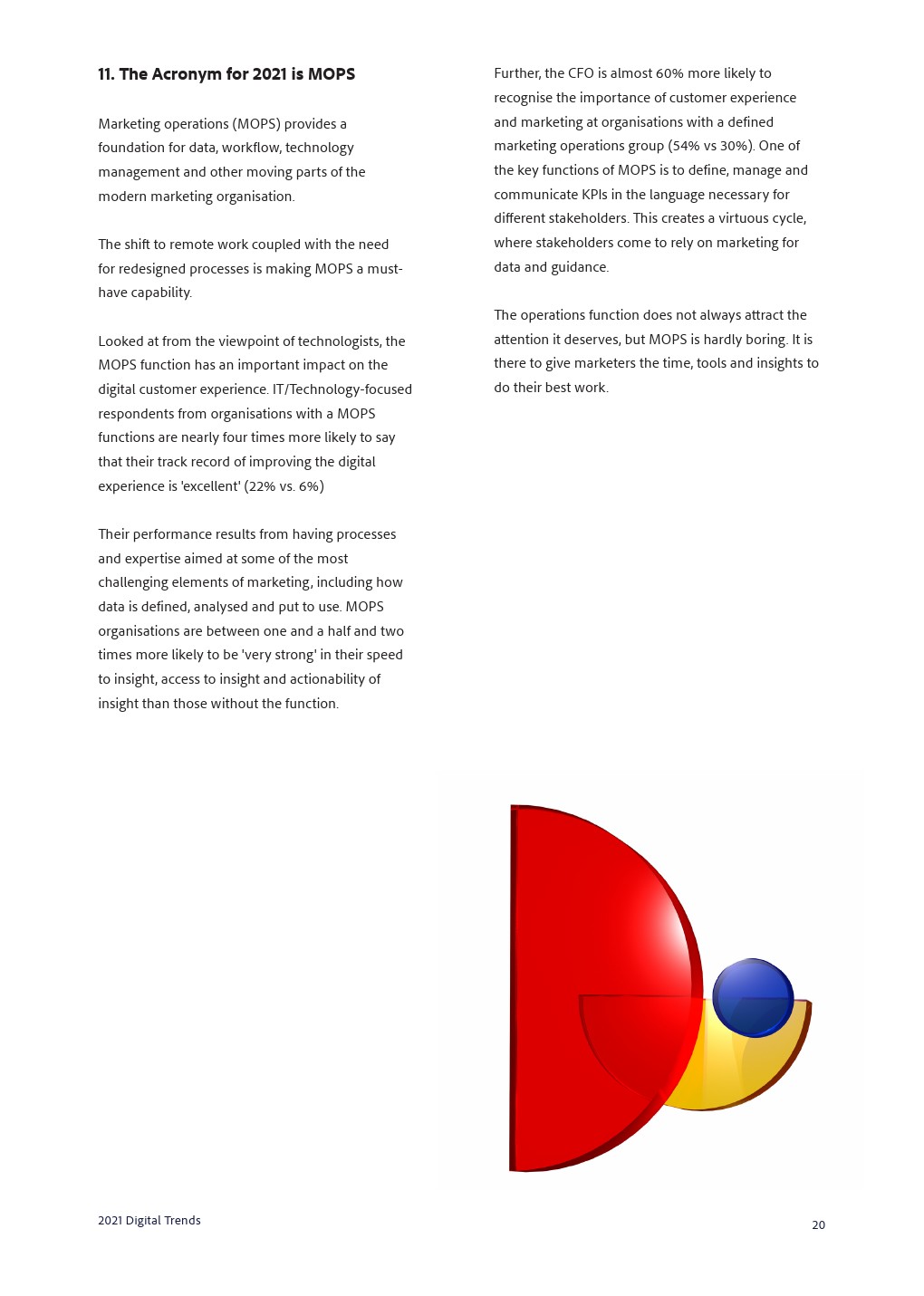 重组洞察力和采取行动的速度对于在瞬息万变的环境中取得成功至关重要,这使工作流程、传统技术和缺乏数字技能成为获得出色数字体验的三大障碍。解决遗留系统问题意味着使用基于云的平台,以及采用更灵活的技术。在数字人群中脱颖而出的必要性使企业寻找新兴体验和营销能力。客户体验管理的技术复杂性挑战着每一个业务流程,这就是为什么MOPS是2021年的缩写。