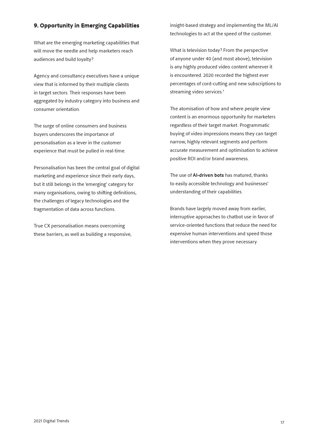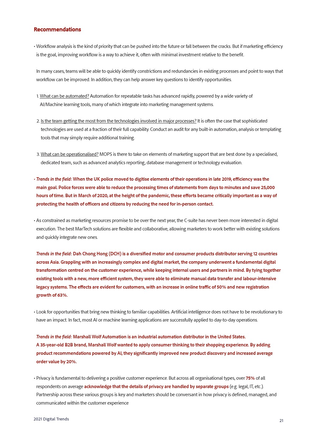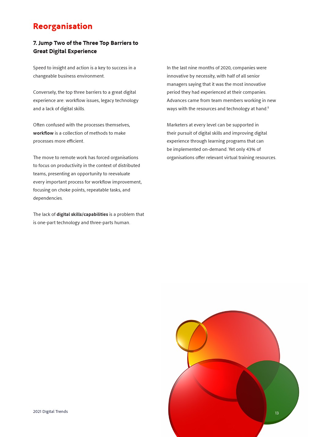 重组洞察力和采取行动的速度对于在瞬息万变的环境中取得成功至关重要,这使工作流程、传统技术和缺乏数字技能成为获得出色数字体验的三大障碍。解决遗留系统问题意味着使用基于云的平台,以及采用更灵活的技术。在数字人群中脱颖而出的必要性使企业寻找新兴体验和营销能力。客户体验管理的技术复杂性挑战着每一个业务流程,这就是为什么MOPS是2021年的缩写。