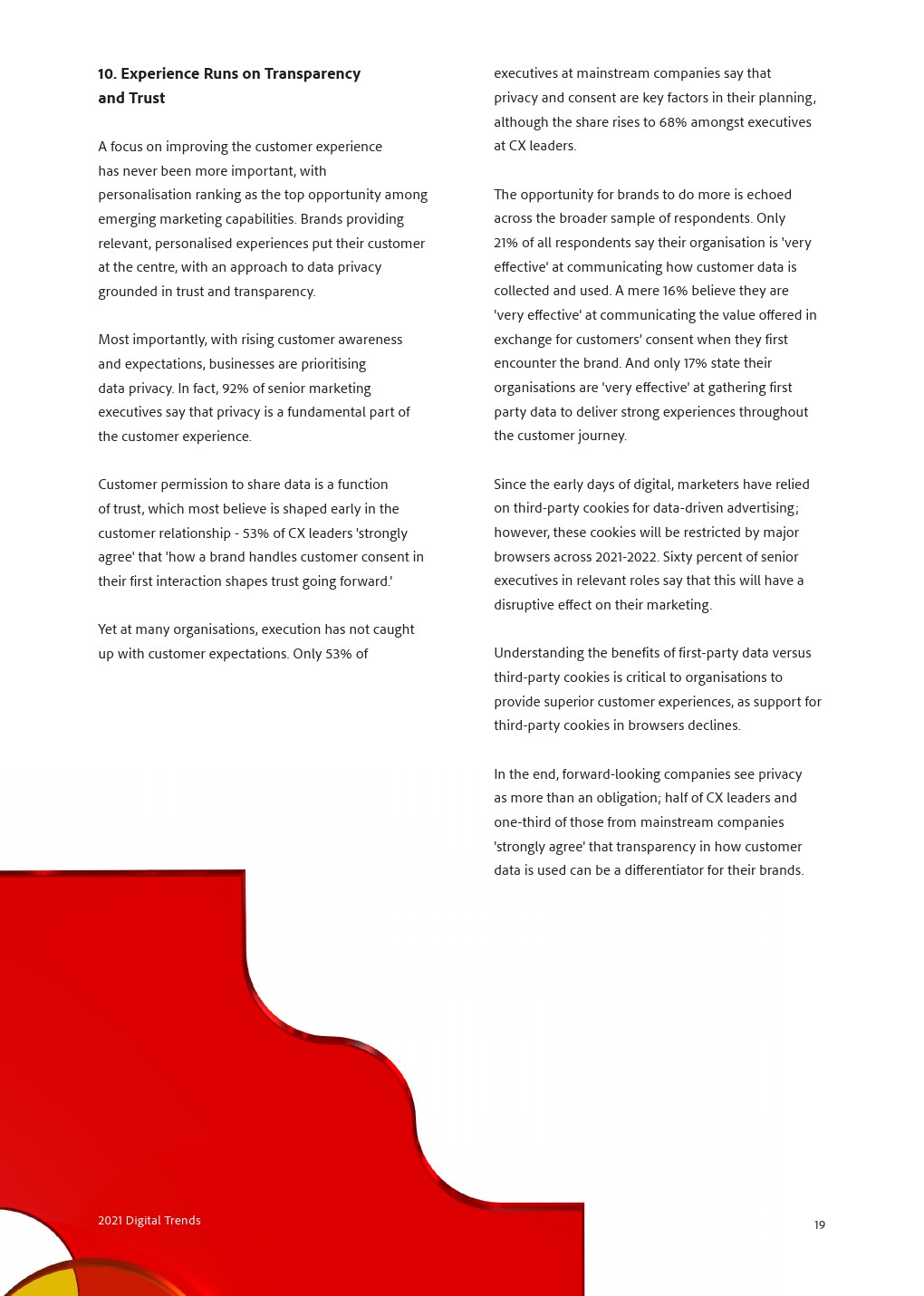 Adobe调查了13,000多名受访者发现,他们的业务侧重于将客户视为人类,将员工视为不可或缺的资产,并将数字客户体验视为增长和战略的驱动力。今年的报告研究了新的领域,并研究了特别重要的领域,包括:分散的员工队伍的影响,作为经验驱动力的同理心,以及如何通过将客户放在第一位的品牌宗旨。