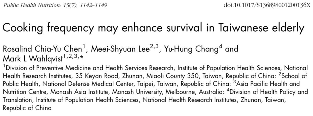 在这项队列研究中,研究人员使用了1999年和2000年台湾老年人营养与健康调查(NAHSIT Elderly)的数据对1937名参与者完成了家庭访谈,包括经济地位,健康形式,烹饪频率,食材选择,营养搭配以及营养素摄入量等,进而探讨台湾烹饪行为与长期生存的关系。