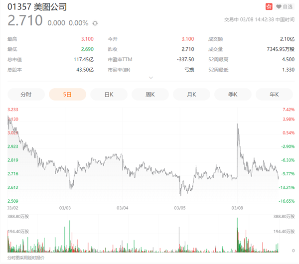 3月8日,美图公司股价高开14.39%,股价报3.10港元,总市值达135亿港元,不过随后一路走低,至截稿时仅为2.71港元,总市值117.5亿港元。