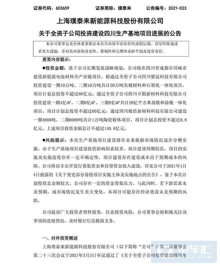 电车汇消息:3月8日,璞泰来公告,公司于近日与四川省成都市邛崃市人民政府签订《战略合作协议》,公司拟在邛崃市投资建设新能源电池材料全产业链项目,项目总投资约为140.8亿元(人民币),其中20万吨负极材料和石墨化一体化项目计划总投资不超过80亿元;20亿平方米基膜和涂覆一体化项目计划总投资不超过60亿元;1万吨陶瓷粉体项目计划总投资不超过0.8亿元。