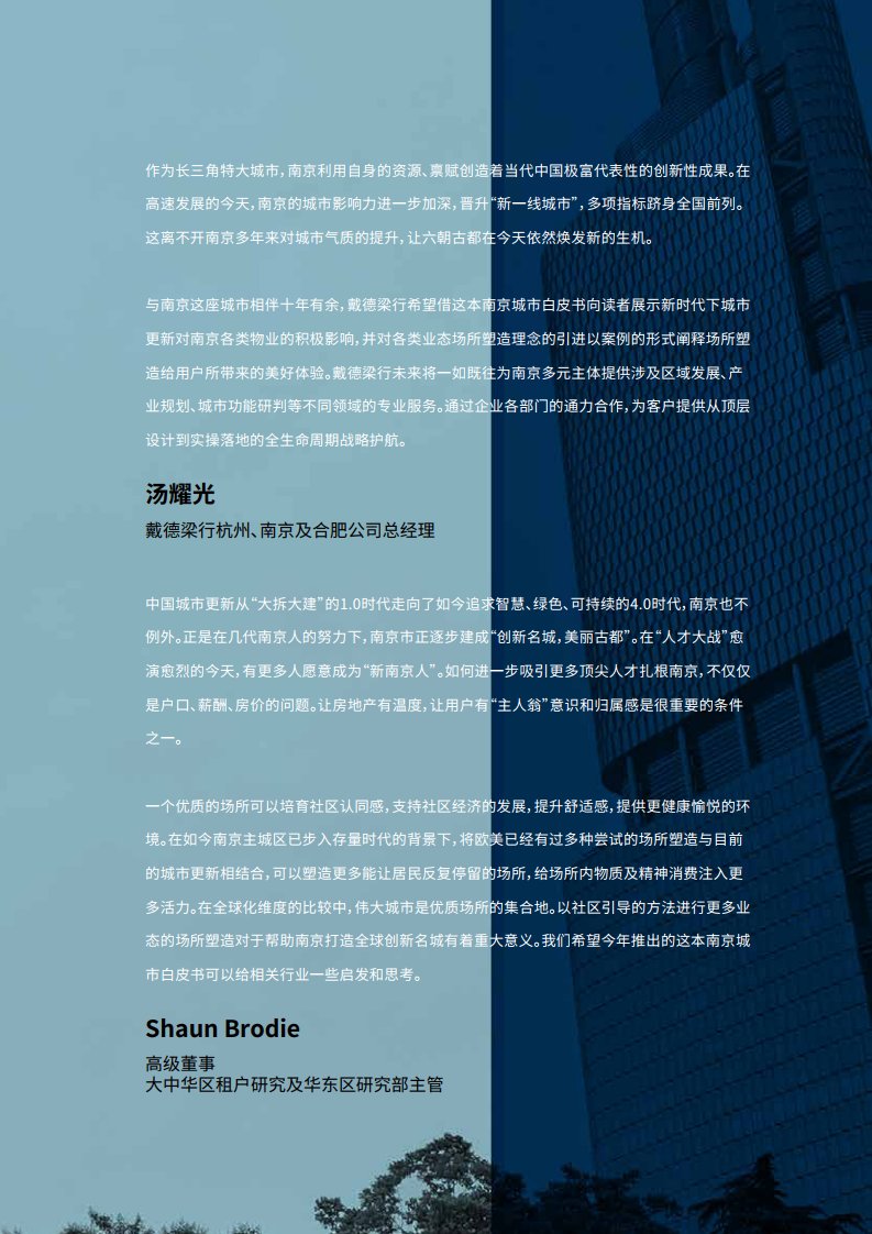 戴德梁行杭州、南京及合肥公司总经理汤耀光表示,作为长三角特大城市,南京利用自身的资源、禀赋创造着当代中国极富代表性的创新性成果。在高速发展的今天,南京的城市影响力进一步加深,晋升“新一线城市”,多项指标跻身全国前列。这离不开南京多年来对城市气质的提升,让六朝古都在今天依然焕发新的生机。与南京这座城市相伴十年有余,戴德梁行希望借这本南京城市白皮书向读者展示新时代下城市更新对南京各类物业的积极影响,并对各类业态场所塑造理念的引进以案例的形式阐释场所塑造给用户所带来的美好体验,希望能给相关行业一些启发和思考。戴德梁行未来将一如既往为南京多元主体提供涉及区域发展、产业规划、城市功能研判等不同领域的专业服务。通过企业各部门的通力合作,为客户提供从顶层设计到实操落地的全生命周期战略护航。