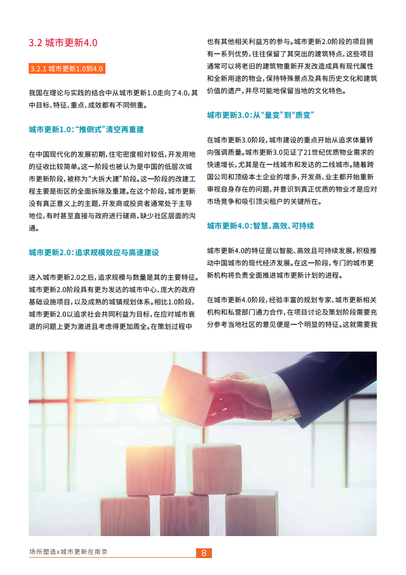 与原先“大拆大建”外延式扩张的发展老路不同,南京的城市更新已步入城市更新4.0的新阶段。 回顾南京的城市更新,经历了从1.0到4.0的升级。城市更新1.0到3.0阶段本质上是以追求经济利益为主要目标导向,以增量式发展为重点的“平稳渐进式”更新,城市更新4.0则是涉及新社区、国际化、强产业链等城市发展各方面的“突破式革新”,通过产业、生活、消费等一系列需求变革,以及土地集约利用和空间复合开发,打造智慧、高效、可持续的城市。