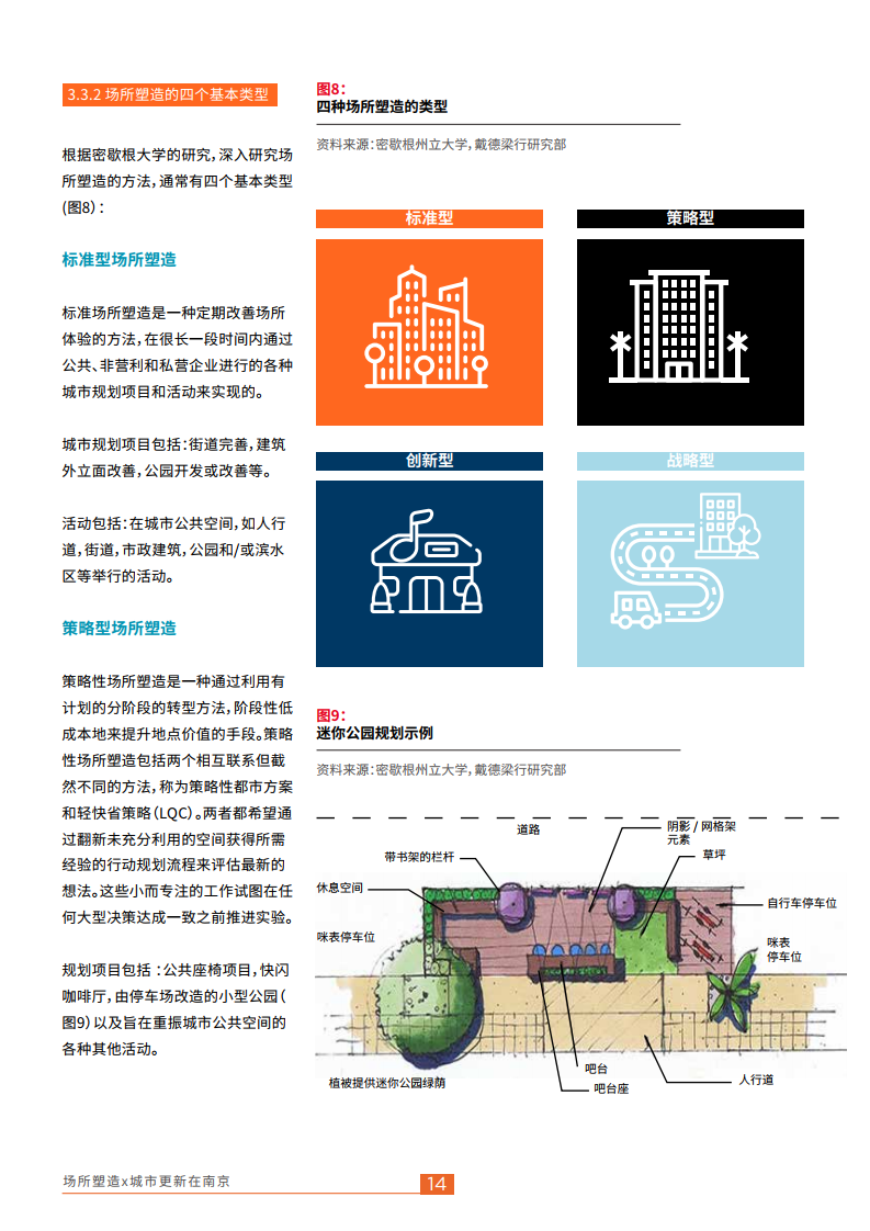 一个优质的场所可以培育社区认同感,支持社区经济的发展,提升舒适感,提供更健康愉悦的环境。在如今南京主城区已步入存量时代的背景下,将欧美已经有过多种尝试的场所塑造与目前的城市更新相结合,可以塑造更多能让居民反复停留的场所,给场所内物质及精神消费注入更多活力。在全球化维度的比较中,伟大城市是优质场所的集合地。以社区引导的方法进行更多业态的场所塑造对于帮助南京打造全球创新名城有着重大意义。
