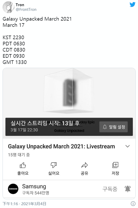 近日有外媒爆料称,三星计划于3月17日在YouTube上进行发布会直播活动。结合此前的曝光来看,这次发布会的主角应该就是Galaxy A52和A72了。目前该条直播链接已经失效,可能是三星方面也发现了不小心泄露的问题。