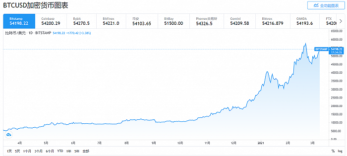 去年9月,比特币价格跌破1万美元,但随后一连上破几个关键心理关口,创下了历史新高。据Tradingview网站,比特币价格在2月21日升至5.8万美元新高后略有下滑。周二亚洲交易时段,比特币价格约为5.4万美元。