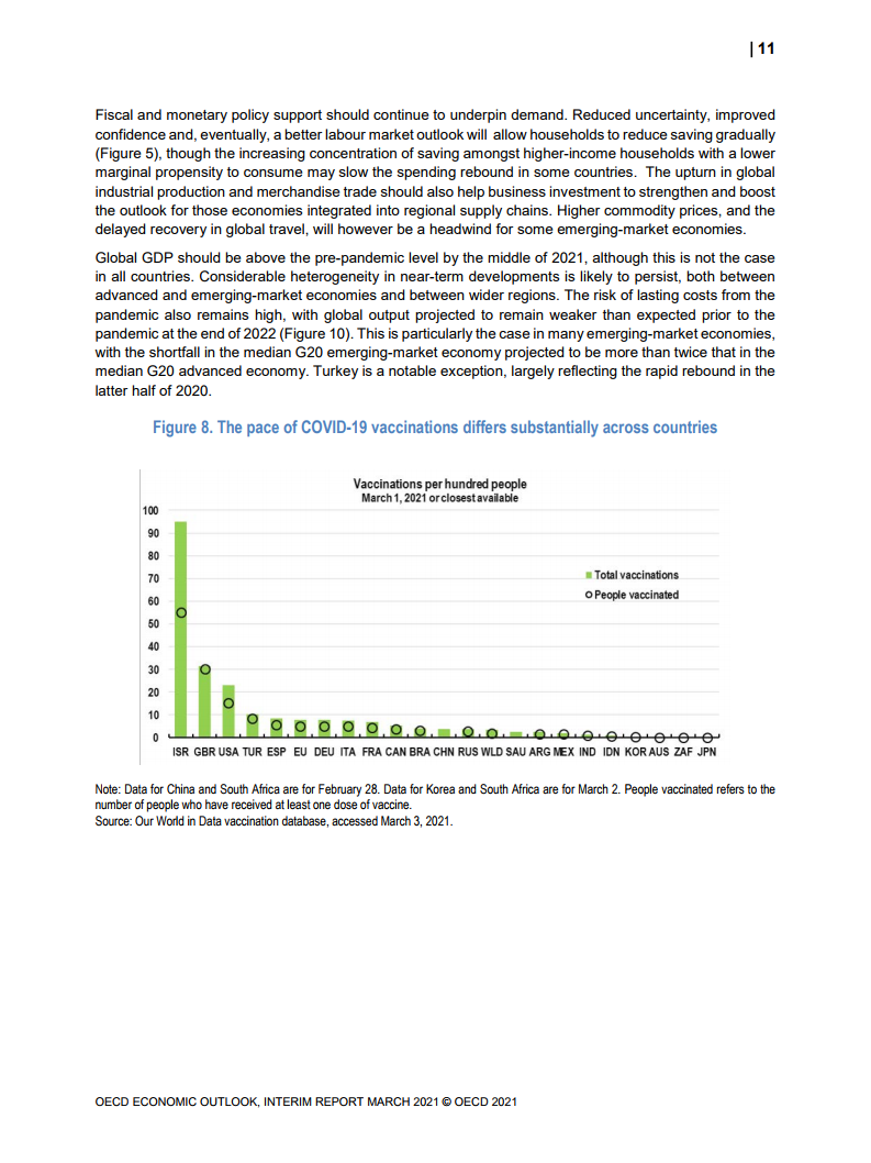 《中期经济展望》呼吁加大疫苗接种力度,采取更迅速、更有针对性的财政刺激措施,以促进产出和信心,并维持对受疫情严重打击的人和企业的收入支持,同时为可持续复苏奠定基础。“速度是关键”,经合组织秘书长安赫尔-古里亚说,“没有自满的余地。必须更快地在全球范围内部署疫苗。这将需要比我们迄今为止看到的更好的国际合作和协调。只有这样,我们才能把注意力集中在更好地向前发展上,为所有人的繁荣和持久复苏奠定基础。”
