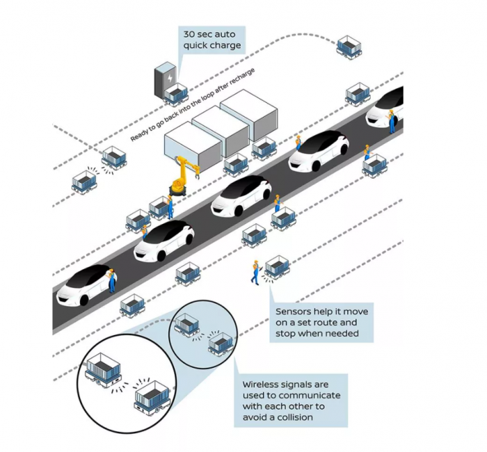 由于磁力轨道的作用,机器人牵引车在工厂车间内沿着预先设定的路径向工人运送零部件,这样他们就不用走神寻找丢失的零部件,可以专注于手头的工作。Oppama工厂有700多辆这种自动导引车(AGV)在运行,全球有4000多辆自动导引车在工厂运行。