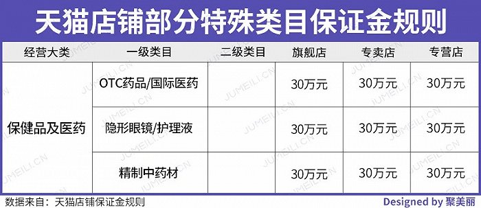 此外隐形眼镜/护理液在天猫入驻所需缴存保证金是归属于特殊类目的,无论是旗舰店、专卖店还是专营店都需要缴纳30w元的保证金。