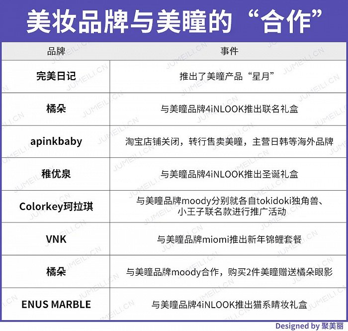 而美瞳爆火后,不少美妆品牌也盯上了这块蛋糕,前不久完美日记就推出了自己的美瞳产品,apinkbaby在宣布关闭淘宝店后就转型售卖日韩等海外美瞳产品,Colorkey、橘朵、稚优泉、VNK等也纷纷与美瞳品牌展开了联动。