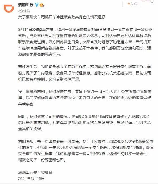 在发生悲剧之后,滴滴专项工作组于3月14日当天前往受害者家中看望家属,“我们深知施暴者的恶行带给这个家庭巨大的伤害,我们将全力协助家属做好善后事宜。”