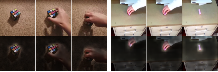 上图展示了由 TimeSformer 学习的自注意力热图的可视化。第一行是原始帧,第二行通过自注意力给出的视频分类重要性来加权每个像素的颜色(被认为不重要的像素会变暗)。TimeSformer 学习参与视频中的相关区域,以执行复杂的时空推理。
