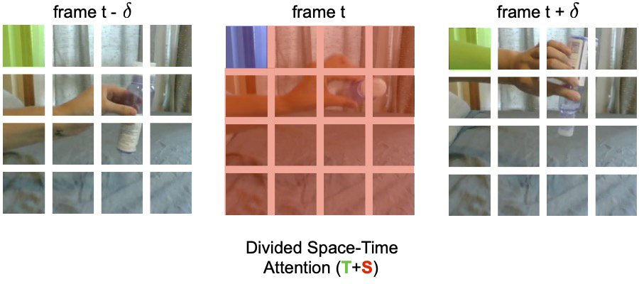 当使用时间注意力时,每个 patch(例如在下图中,蓝色的正方形)只与其他帧中相同空间位置的 patch(绿色正方形)进行比较。如果视频包含 T 帧,则每个 patch 只进行 T 次时间上的比较。当使用空间注意力时,每个 patch 仅与同一帧内的 patch(红色 patch)进行比较。