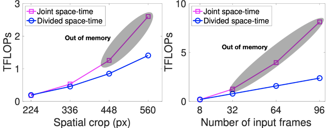TimeSformer 的高效让在高空间分辨率(例如高达 560x560 像素的帧)和长视频(包括高达 96 帧)上训练模型成为可能。