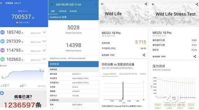 从最终测试结果可以看出,魅族 18 Pro安兔兔跑分达70余万,在GeekBench 4.2.3Pro中获得5028的单核成绩以及14398的多核成绩,在3DMark常规及20分钟压力测试中魅族 18 Pro也获得了不俗的成绩。由此可见,魅族 18 Pro的性能处于主流旗舰手机的第一梯队。