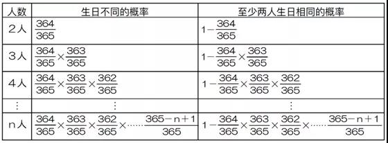 这样考虑起来的话,还可能出现三个人出生在某一天,四个人出生在另外一天之类的复杂情况。如果想要列举每个可能的组合,再把概率相加,事实上几乎是不可能完成的任务。
