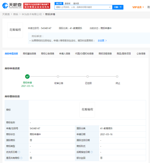 新浪科技讯 3月22日下午消息,天眼查App显示,近日,华为技术有限公司申请注册“花瓣编程”“花瓣少儿编程”商标,国际分类包括科学仪器、教育娱乐等,目前商标状态为“商标申请中”。