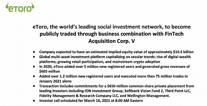 此次公告披露,合并后实体eToro Group Ltd预计的隐含股本价值约为104亿美元,其中,eToro的隐含企业价值预估为96亿美元。此次交易包括在私募中筹集6.5亿美元,投资者有ION Investment Group、软银愿景二号基金、Third Point LLC、富达(Fidelity)、惠林顿管理公司,均将以每股10美元价格获得股票,现有eToro投资者将持有合并实体91%的股份。合并预计在2021年第三季度完成,但需获得股东批准等条件。