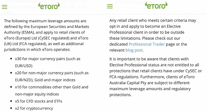 平台页面介绍,eToro在英国、欧洲等辖区,根据监管对于平台上的主要货币交易对提供30倍杠杆、对非主要货币交易对提供20倍杠杆、对除了黄金和非主要股票指数外的商品提供10倍杠杆、对加密货币提供2倍杠杆,并表示零售用户可以通过被认定为专业投资者规避上述杠杆上限。