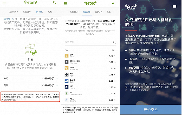 目前,eToro中文应用显示,差价合约、加密货币业务的介绍下,均提到其澳洲公司的注册号,或指业务受到澳洲方面监管。此外,eToro介绍,其还提供加密货币投资产品CryptoCopyPortofolio。
