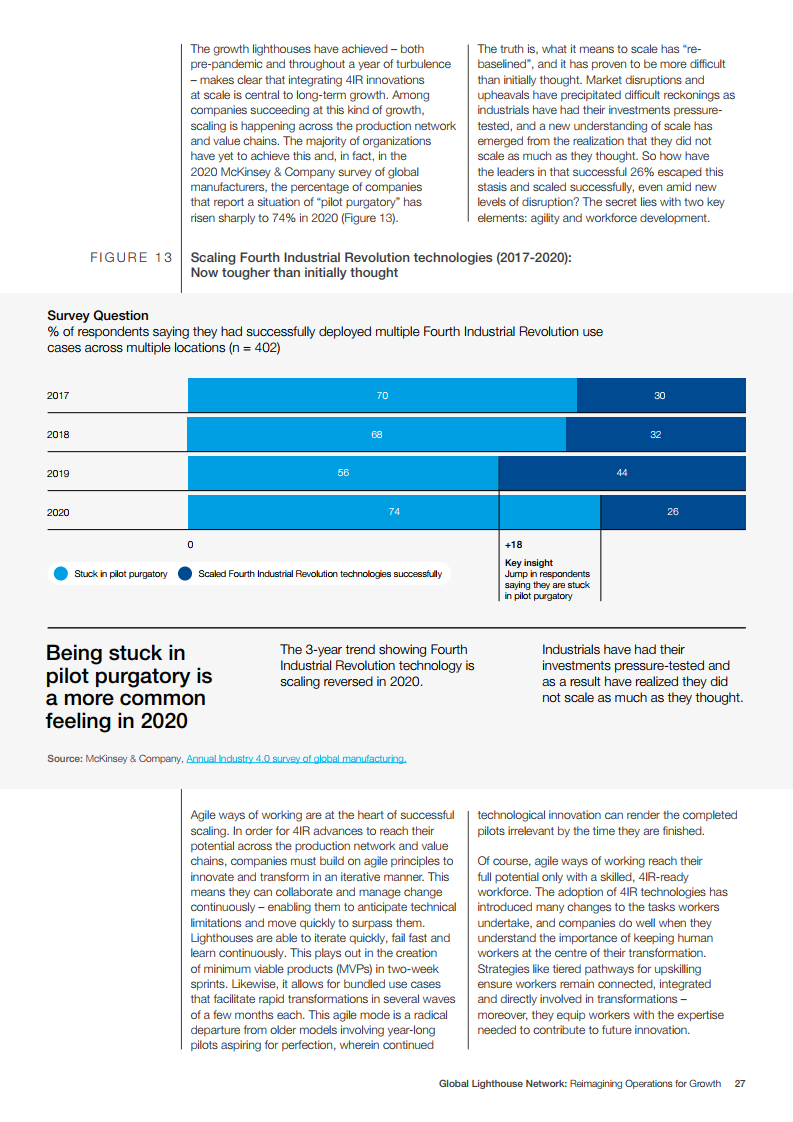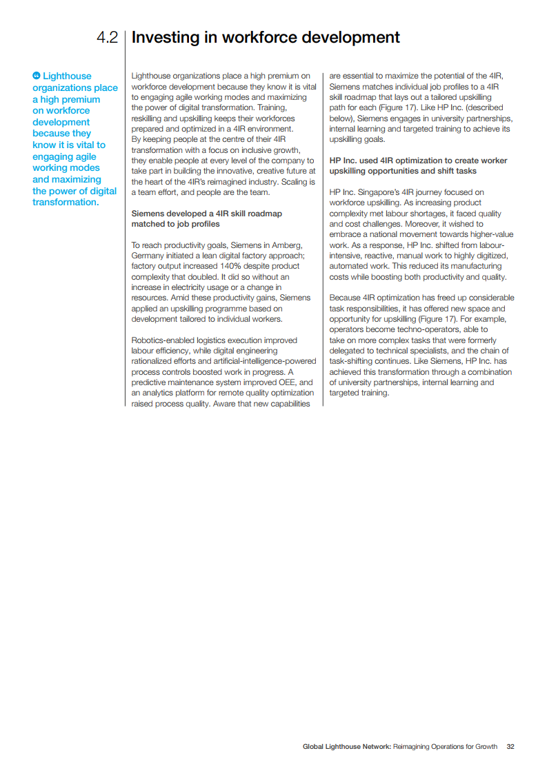 虽然74%的企业在2020年陷入了试点困境,但基于网络企业实践经验的相关研究显示,可拓展的第四次工业革命技术对于企业的长期发展至关重要。通过全面采取灵活的运作方式,这些制造企业已经有效应对了生产网络和价值链受到的颠覆性影响,以及供需关系的持续变化。与此同时,它们还以同样的速度和规模,优先发展劳动力队伍,为员工提供技能再培训和升级培训,帮助他们为适应高级制造业岗位做好准备。