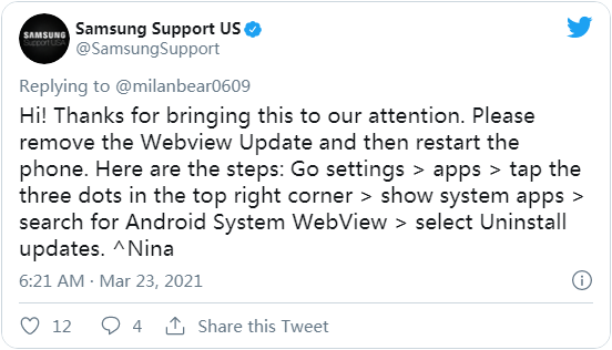 近日,许多用户在网上抱怨其 Android 应用出现了难以避免的崩溃问题。谷歌在调查后发现,问题与系统中的 WebView 组件有关。与此同时,三星官方支持账号在 Twitter 上给出了一个临时解决方案,建议用户转到“设置 → 应用”,点击右上角的“…”→“显示系统应用”,然后搜索并写在“Android System WebView”更新。