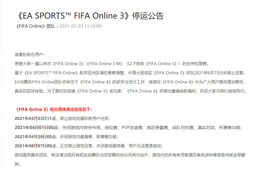 据了解,《FIFA Online 3》将于即日起停止游戏充值和新用户注册,4月1日关闭游戏内转会市场、排位赛、PVP友谊赛等功能,6月7日零点,正式停止游戏运营,关闭游戏服务器,届时用户将无法登录游戏。