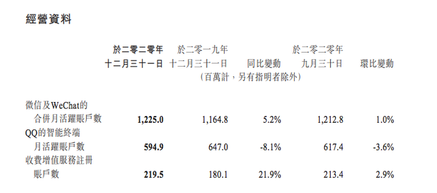 财报显示,腾讯QQ智能终端月活跃账户数为5.95亿,同比减少8.1%。