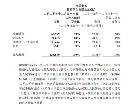财报显示,四季度腾讯网络游戏收入增长29%至人民币391亿元,其中海外游戏收入同比增长43%至人民币98亿元。该项增长主要反映包括《和平精英》、《王者荣耀》、《PUBGMobile》及近期推出《天涯明月刀手游》在内的智能手机游戏带来的收入贡献。