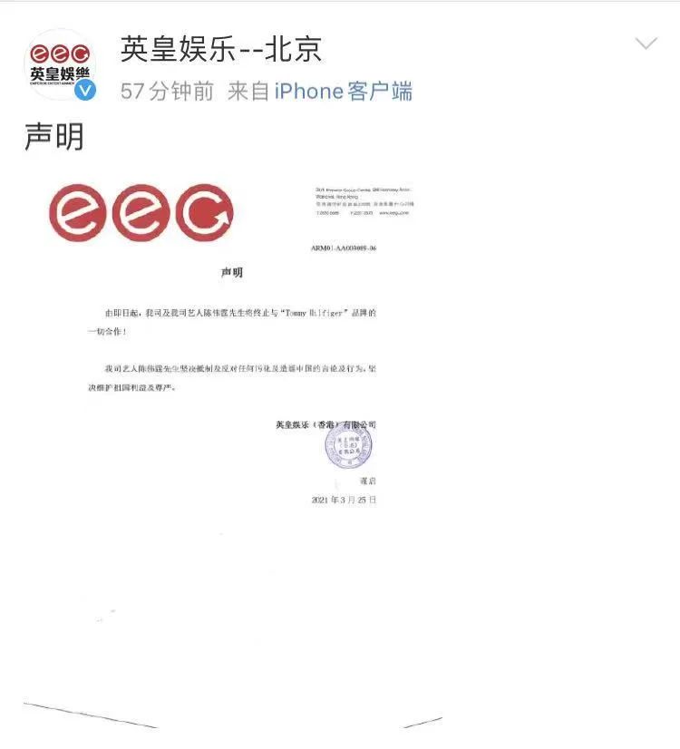 刚刚,英皇娱乐发表声明表示,该公司及其艺人陈伟霆将终止与“Tommy Hilfiger”品牌的一切合作。2021年1月,Tommy Hilfiger宣布陈伟霆成为2021年男装品牌代言人。