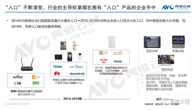 2014年智能路由器成为智能家居行业的切入口,而后传统企业理所当然选择擅长的产品作为抢占流量的入口。2017年,智能音箱因语音交互的搭载,大受市场青睐,2018年智能音箱增幅823%。2019年,带屏交互入口成为市场宠儿,智能投影、屏幕音箱、智能电视等预计有着长足的发展。视觉交互在效率、体验、安全感等方面均优于听觉交互。