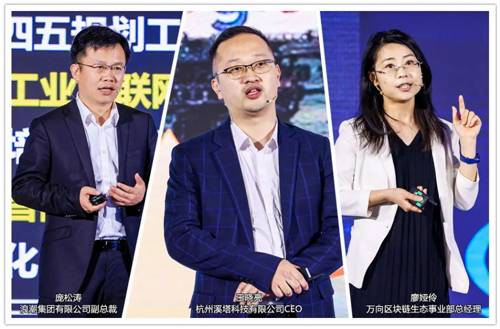在区块链主题分享环节,浪潮集团有限公司副总裁庞松涛分享了浪潮对推进标识解析整个体系以及区块链促进数据自由流动的思考;杭州溪塔科技有限公司CEO王晓亮分享了分布式数字身份如何赋能工业及赋能互联网经济;万向区块链生态事业部总经理廖娅伶通过对汽车零部件、钢铁等行业的案例分析了区块链对数字化转型的作用。