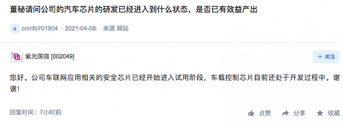 4月12日,紫光国微在互动易上表示,公司车联网应用相关的安全芯片已经开始进入试用阶段,车载控制芯片目前还处于开发过程中。