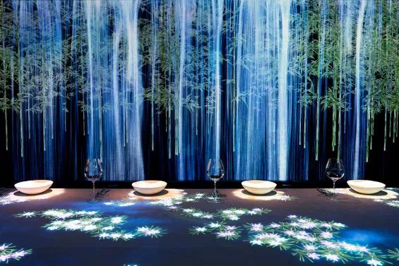 MoonFlower Sagaya Ginza Art by teamLab 每天只能容纳8位客人,一次会呈上12道不同的菜肴。菜单会根据日本四季的风格进行更新,例如:春日樱花,夏之莲花,秋之红叶,冬季山茶……每道菜肴上桌后,桌面和背景墙上会随之展现自然美景。不仅如此,投影的图像还会受到餐盘大小和餐者行为的影响。