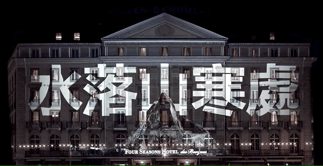 在2018年的日内瓦钟表展期间,Supermafia还受邀将日内瓦四季酒店的外立面作为“画布”,创作了一个名为《拼字游戏》的大型建筑投影项目。英文、法文、中文、日文、阿拉伯文、俄文词句幻化为简洁有力的图像,为建筑外立面带来视觉上的变形,让观众感受到建筑投影的震撼。