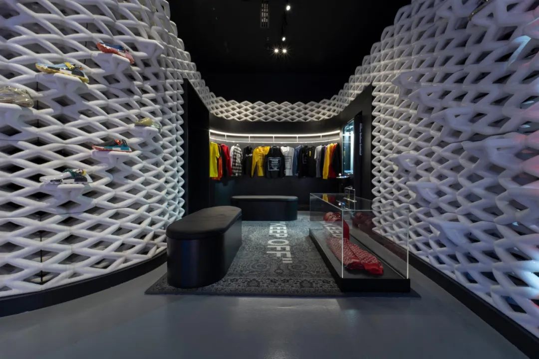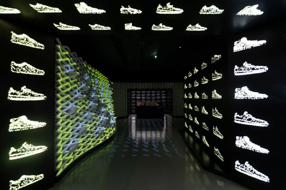 3D打印和视听媒体是店内最具特色的设计元素。整个空间分为三个区域:服装区、购物区,以及设计亮点之一的体验室——被工作室称之为“迷你运动鞋博物馆"。屏幕展示着富有动感美学的数字艺术;运动鞋陈列在3D打印的白色网格墙上……无疑,以Presentedby为代表的一系列品牌正在创造新一代的商业美学。