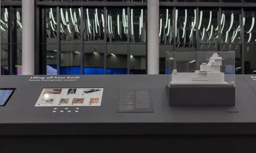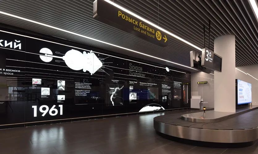 首先迎接乘客的是位于主厅的巨大屏幕。跳脱的抽象动画描绘了太空生物的冥想运动,并介绍了作为孤独梦想家的“太空人”无所畏惧的精神。 机场的数字展览则致力于展现与太空探索有关的未来项目——其中一些是乌托邦式的,有些已经被事实证明;在长达30米的展示桌上,旅行者可以回顾太空飞行和宇宙飞船的想法最初如何出现在思想家和前卫艺术家的观念中,以及这些“复古未来主义者”如何影响后来的流行文化。
