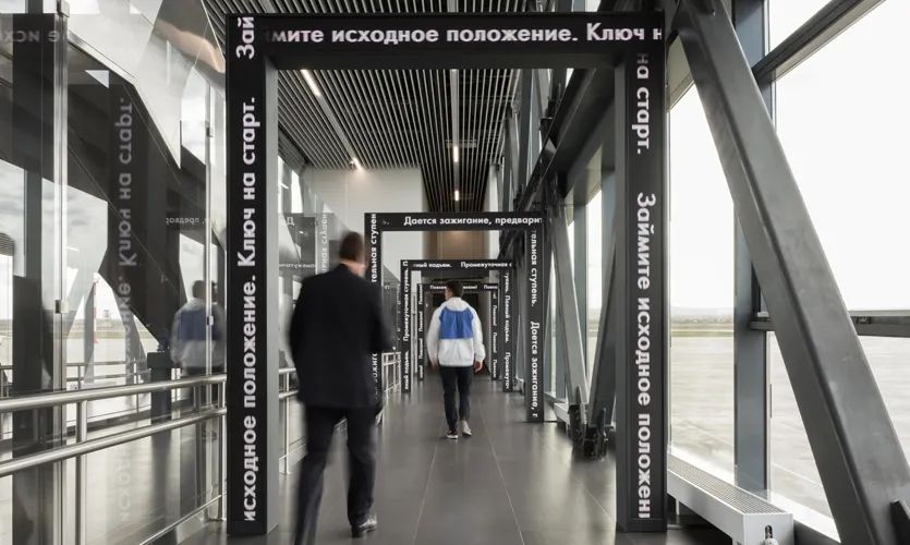 通向飞机的走廊是沉浸式体验的高潮。乘客会穿过五座拱门,在这期间,尤里·加加林(Yuri Gagarin)和航天工程师谢尔盖·科罗廖夫(Sergey Korolev)在宇宙飞船发射前的谈话记录和录音不断回响。