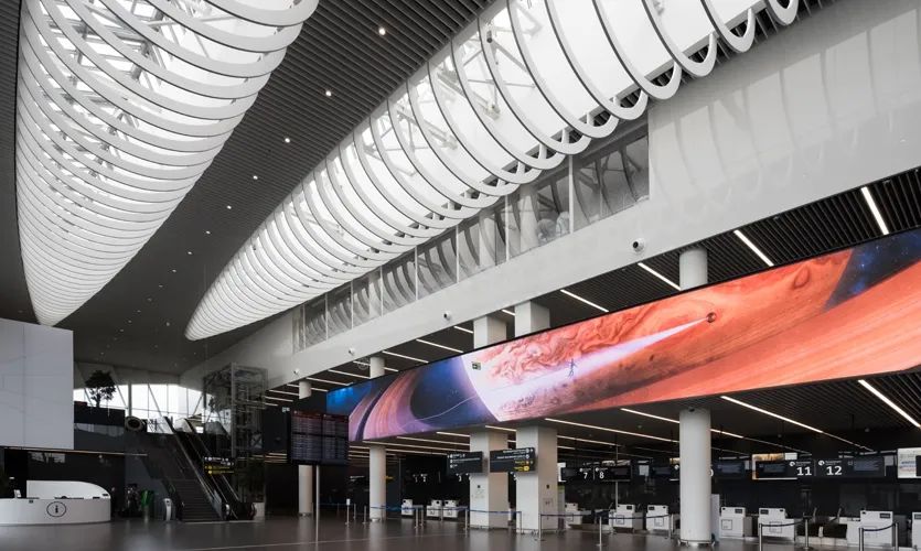 俄罗斯萨拉托夫的加加林国际机场(Gagarin International Airport)于2019年投入运营,并邀请Radugadesign工作室为其打造了一个永久的多媒体装置,展现了人与太空之间的关联。七个数字装置散落在机场各处,激发着游客的所有感官,创造着如飞行探险家般的身临其境的体验。